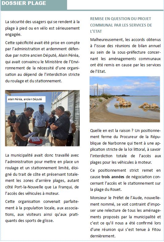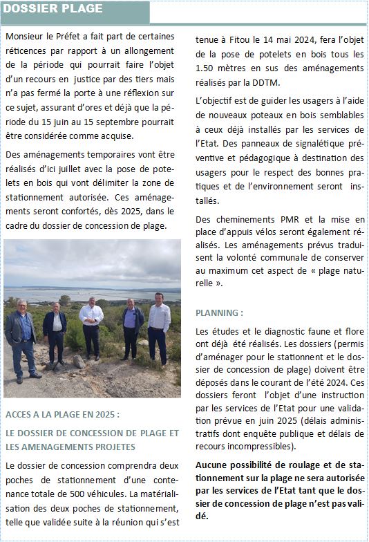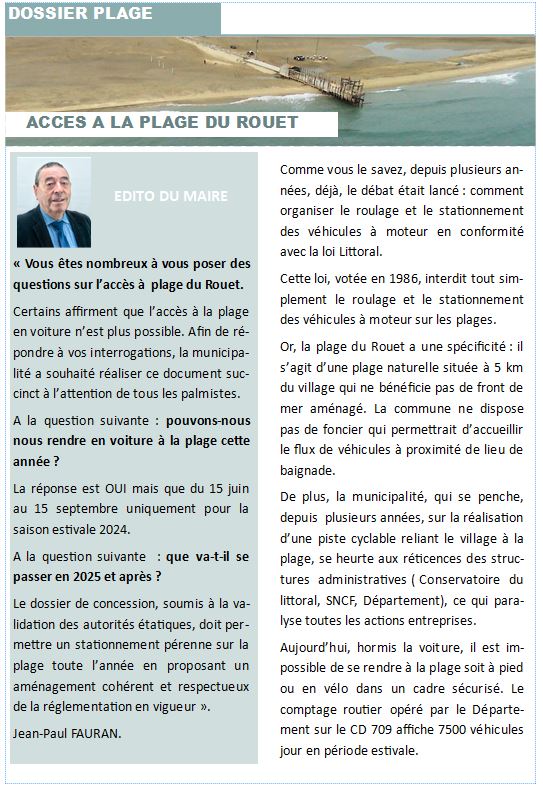 Beaucoup d'informations ont circulées concernant l'accès à la plage du Rouet, la maire de La Palme a publié, le 4 juin 2024, un petit document qui fait le point sur le dossier, document que vous trouverez sur le site Facebook de la mairie https://www.facebook.com/MairieLaPalme