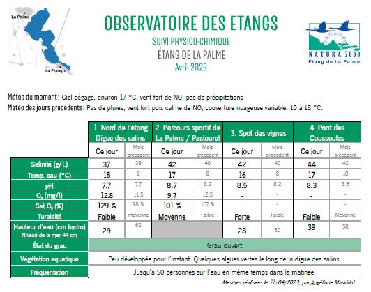 Avec ce lien, vous pouvez aller tétécharger le dernier observatoire de l'étang de LA PALME réalisé le 11 avril .